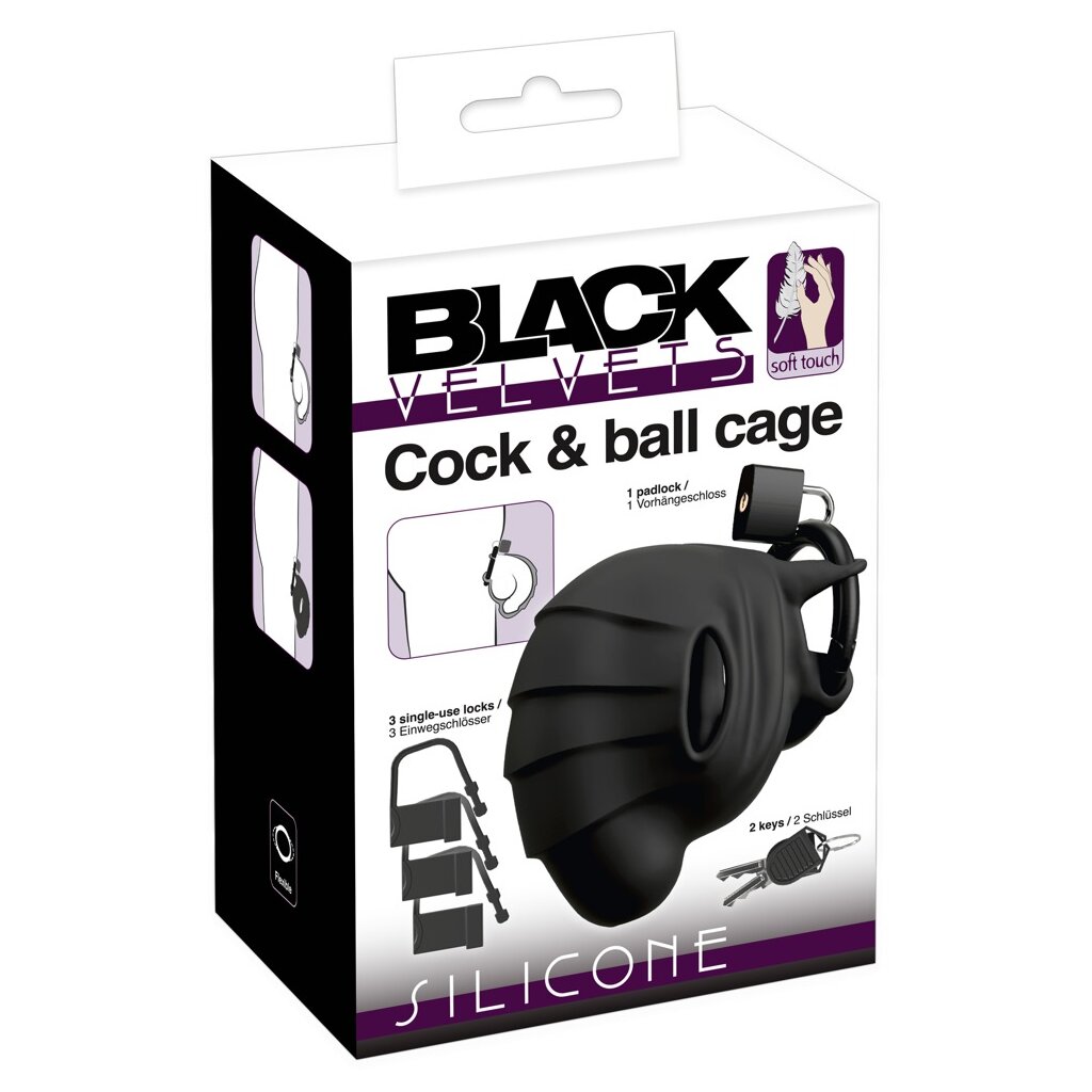 The silicone Cock & ball cage from Black Velvets imprisons the cock and balls in an exciting way. The flexible cage adapts perfectly to the male anatomy and can be easily put on and taken off. The velvety soft silicone clings wonderfully and comfortably to the cock and balls. A sturdy ring keeps the lightweight silicone cage in place. There is a hole at the bottom for urinating. The cock/ball cage can also be locked – 1 padlock with keys and 3 single-use padlocks are included.