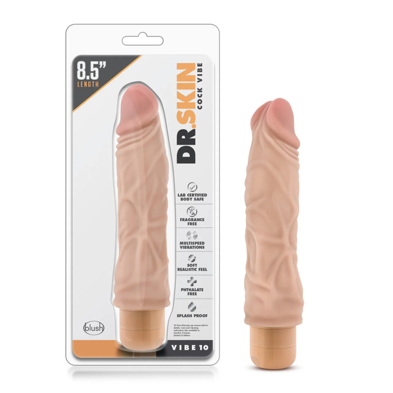 The doctor is in! Dr. Skin Cock Vibe 10 is a realistic vibrating dong with a veiny, textured shaft that erotically massages as you thrust. The powerful, throbbing vibrations are controlled by a convenient, high-to-low twist-dial base. It’s waterproof for shower and bath time. Vibe 10 is made of non-porous and body safe PVC that contains no phthalates, latex, paraffins, or chemical fragrances. To clean, use soap and water or a toy cleaner, then let air-dry.
